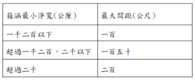 (一)槽數為二槽以上,形狀為矩形或圓形,具水密性構造,矩形槽之寬應為水深之一倍至二倍,有效水深三點五公尺至五公尺,出水高應為五十公分。