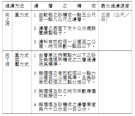 (二)淘洗槽之形狀為圓形或矩形,有效水深為三點五公尺至四點五公尺。槽之固體物負荷為每日每平方公尺六十公斤至九十公斤。
