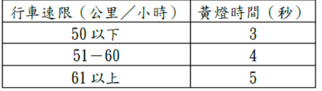 一、行車管制號誌之黃色燈號時間得依下表之規定: