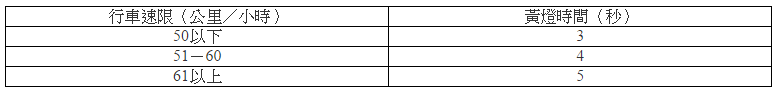 一、行車管制號誌之黃色燈號時間得依下表之規定:(略)