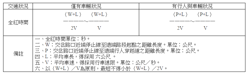 二、行車管制號誌在黃色燈號結束後,應有一秒以上之全紅時間。直行交通之全紅時間,宜依下表公式計算之。(略)