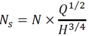 十九、比速:表示抽水機形式及特性之指數。為與抽水機幾何相似之一段翼輪能壓送每分鐘一立方公尺之水升高一公尺時所需之每分鐘轉速數,其計算式如下: