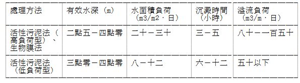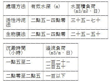 (二)淘洗槽之形狀為圓形或矩形,有效水深為三點五公尺至四點五公尺。槽之固體物負荷為每日每平方公尺六十公斤至九十公斤。