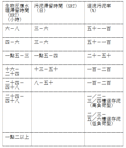 五十六、生物反應水理滯留時間(Hydraulic Retention Time,縮寫為 HRT):污水在生物反應槽內之停留時間。