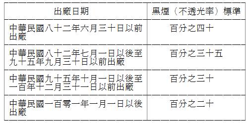(一)柴油車輛黑煙(不透光率)標準: