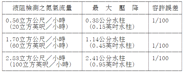 五、油氣管線液體阻塞檢驗測定(以下簡稱液阻檢測):指以氮氣代替油氣,注入加油機至油槽之油氣管線中,量測管線中產生之壓降,藉以測試油滴回流至油槽之能力。