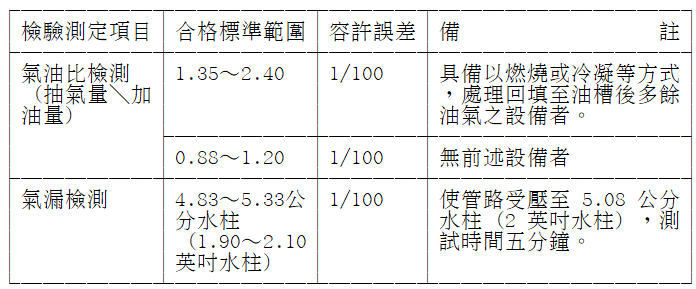 加油站應維持加油槍及油氣回收設施有效操作,其氣油比檢測及氣漏檢測應符合下列規定: