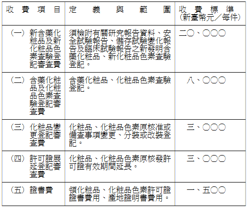 化粧品及化粧品色素查驗登記項目之收費標準如下: