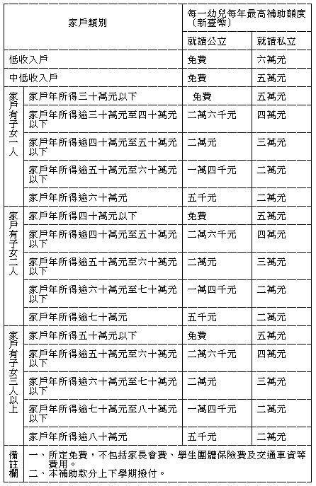 一、對低收入戶、中低收入或家戶年所得總額新臺幣三十萬元以下之家庭,提供幼兒免費就讀公立幼稚園之措施;其因公立幼稚園及托兒所供應量不足而就讀私立幼稚園者,每學期補助最高以公立幼稚園收費總額為限,其他原因就讀私立幼稚園者,每學期最高補助新臺幣一萬元。
