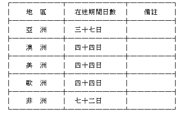 當事人非居住於臺灣地區者,其在途期間之標準如下表: