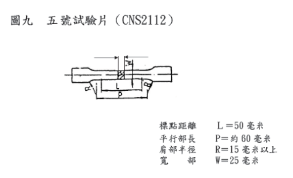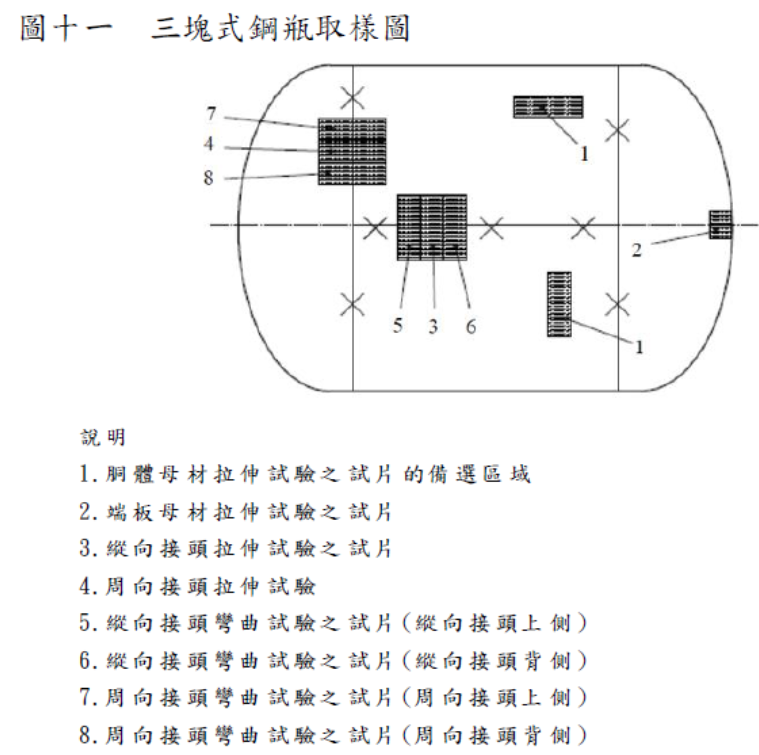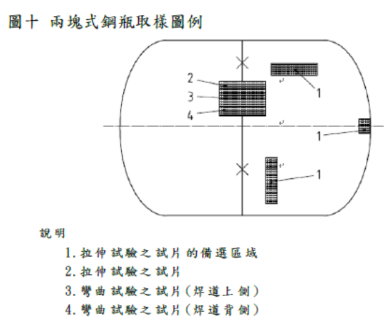 (一)沿著瓶身縱向處,依CNS2112金屬材料試驗片裁取五號試片(如圖九)直截試片一只,予以展平,不得以搥打方式為之。試片取樣位置如圖十、圖十一。但沿著瓶身縱向處取樣有困難者,得沿周向或在端板之中心取樣。