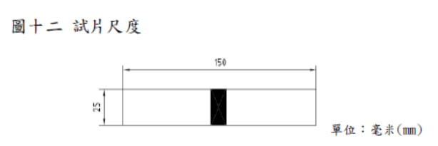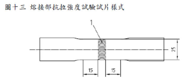 (一)依圖十、圖十一位置於瓶身取樣,在常溫下展成平片,不得以搥打方式為之。試片收縮截面寬度應為二十五毫米,長度應為沿焊道邊緣二側延伸各十五毫米(如圖十三);超過試片中間部分之寬度可逐漸增加。