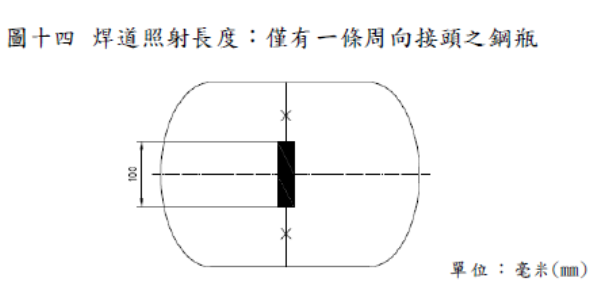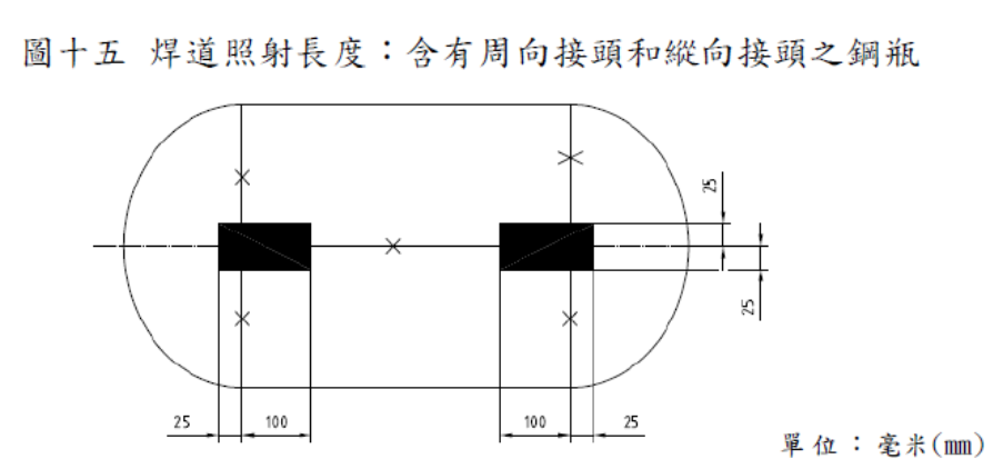 八、放射線照相試驗:取一支容器,依圖十四、圖十五之縱向接頭與周向接頭交叉部位,依ISO17636對焊道進行照相。