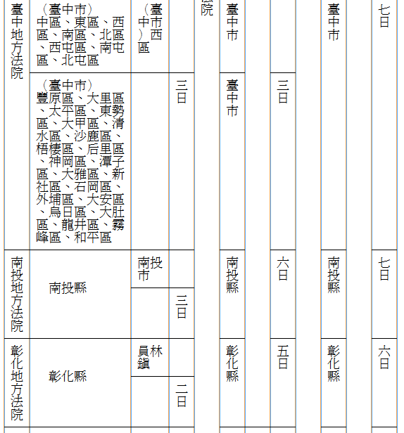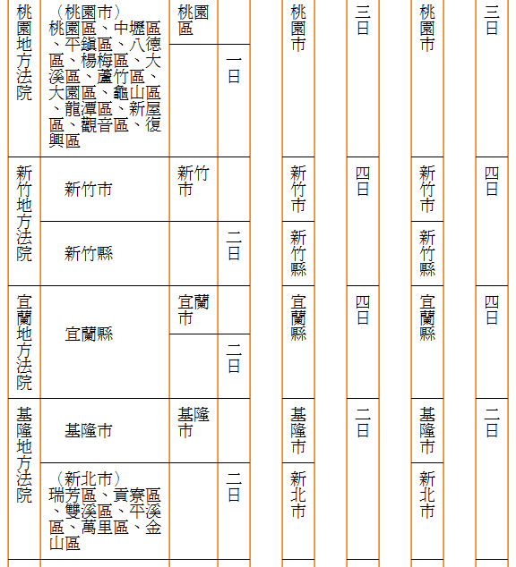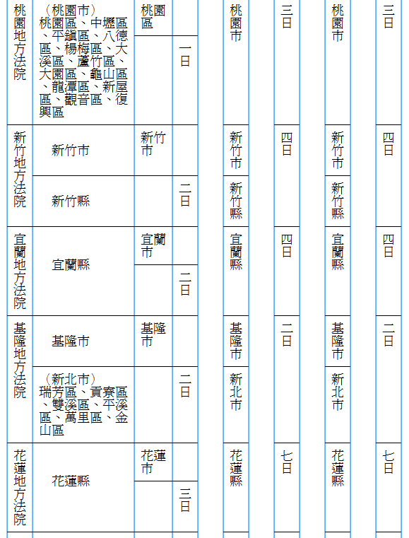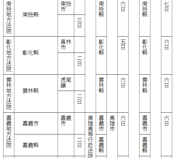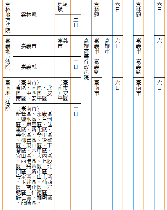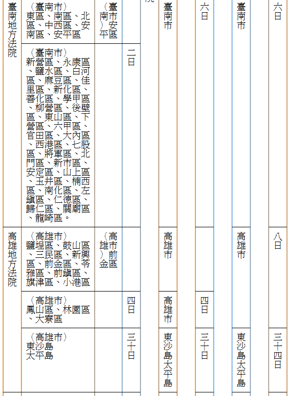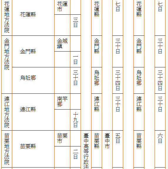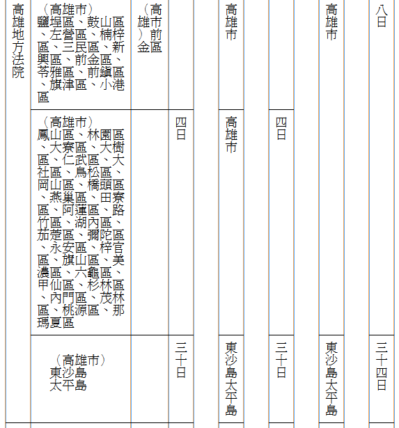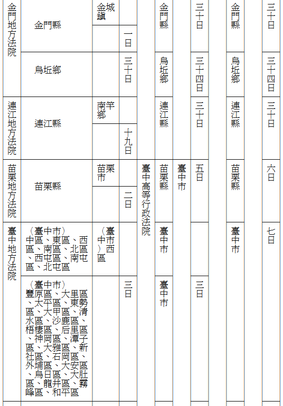 (一)當事人非居住於管轄區域內者,除本款第二目及第三目之規定外,其在途期間按該行政法院區域之在途期間日數(日數不同者,按最長日數,但臺灣高雄地方法院以四日計,高雄高等行政法院以八日計,福建金門地方法院以十九日計,臺北高等行政法院以七日計),再加其居住地地方法院管轄區域內之在途期間日數(日數不同者,按最長日數,但臺灣高雄地方法院除居住東沙島、太平島者以三十日計外,餘以四日計,福建金門地方法院除居住烏坵鄉者以三十日計外,餘以十九日計)計算。