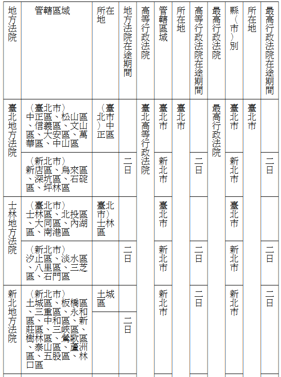 (二)臺灣臺北地方法院、臺灣士林地方法院及臺灣新北地方法院間在途期間之計算,除當事人居住臺灣臺北地方法院所轄臺北市各區,而向臺灣士林地方法院為訴訟行為,或當事人居住臺灣士林地方法院所轄臺北市各區,而向臺灣臺北地方法院為訴訟行為者,均不計在途期間外,其餘均以在途期間二日計算。
