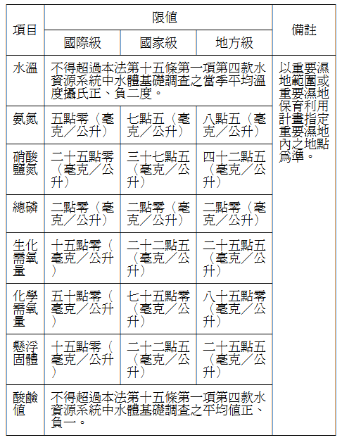 ﹝3﹞前二項入流水項目及限值於重要濕地保育利用計畫另有較嚴格之規定者,從其規定。